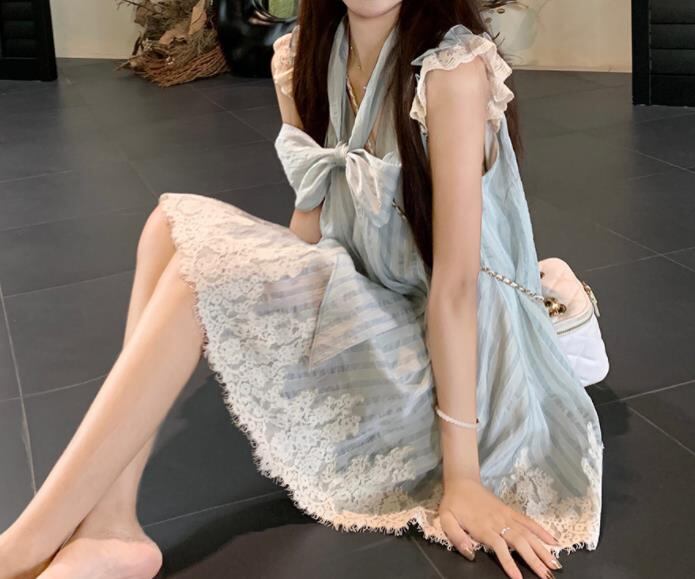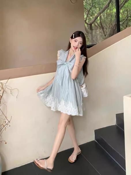 2024春夏新作 女 レディース ハイウエスト 袖なし ボーダー柄 ミニ ワンピース ドレス 台型スカート