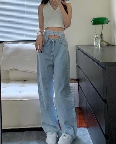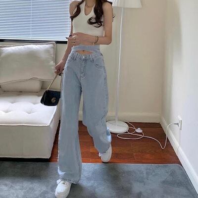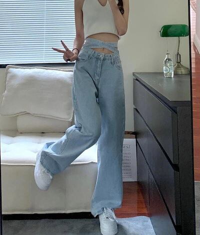 バックリボンハイウエストストラップジーンズ バックリボンデニムパンツ ワイドレッグパンツ ワイドレッグジーンズ ジーンズ水色 水色 ライトブルー 韓国 オルチャン レディース ハイウエストパンツ | OPEN-korea