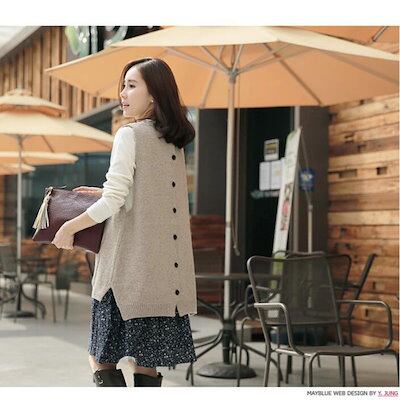 ニットベスト レディース ベスト 春 秋 冬 ニット サイドスリット 後ろボタン 厚手 重ね着 ベスト レイヤード風 ロングベスト ゆったり 着回し