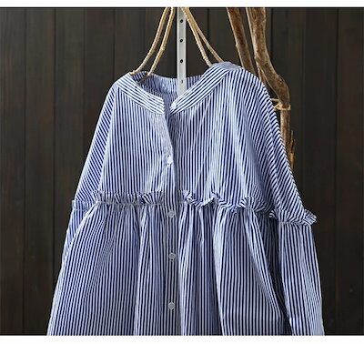 長袖シャツ レディース シャツ 秋 ストライプ シャツ 長袖 きれいめ フリル 綿 コットン 羽織る 白シャツ トップス バンドカラー シャツブラウス ボタン 前開き ワイシャツ 柄 ギャザー 体型カ | OPEN-korea