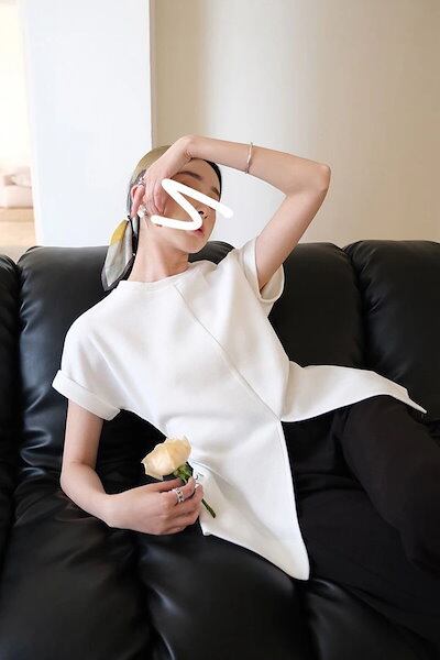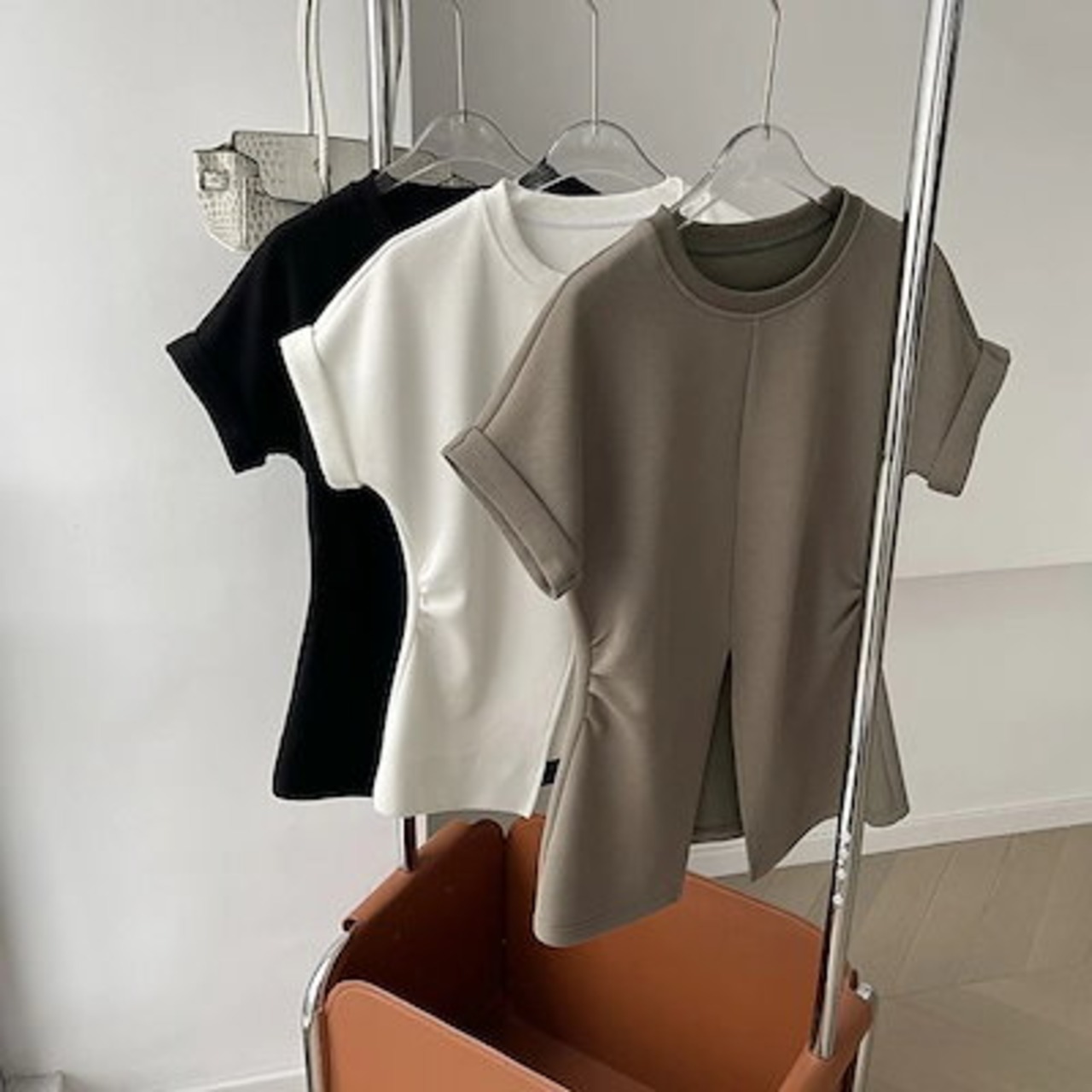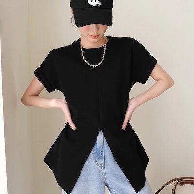 夏 人気なTシャツ 半袖 シフォンブラウス ゆったり ウエスト引き締め デザイン スリット ラウンドネック 半袖 トップス 着やせ 半袖 ゆったり 韓国ファッション レディース | OPEN-korea