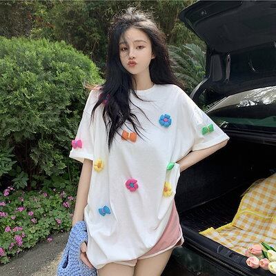 夏 人気なTシャツ Tシャツ 半袖 UVカット 花柄 Tシャツ ブラウス シャツ 着痩せロングTシャツ ゆったり tシャツ 韓国ファッション レディース