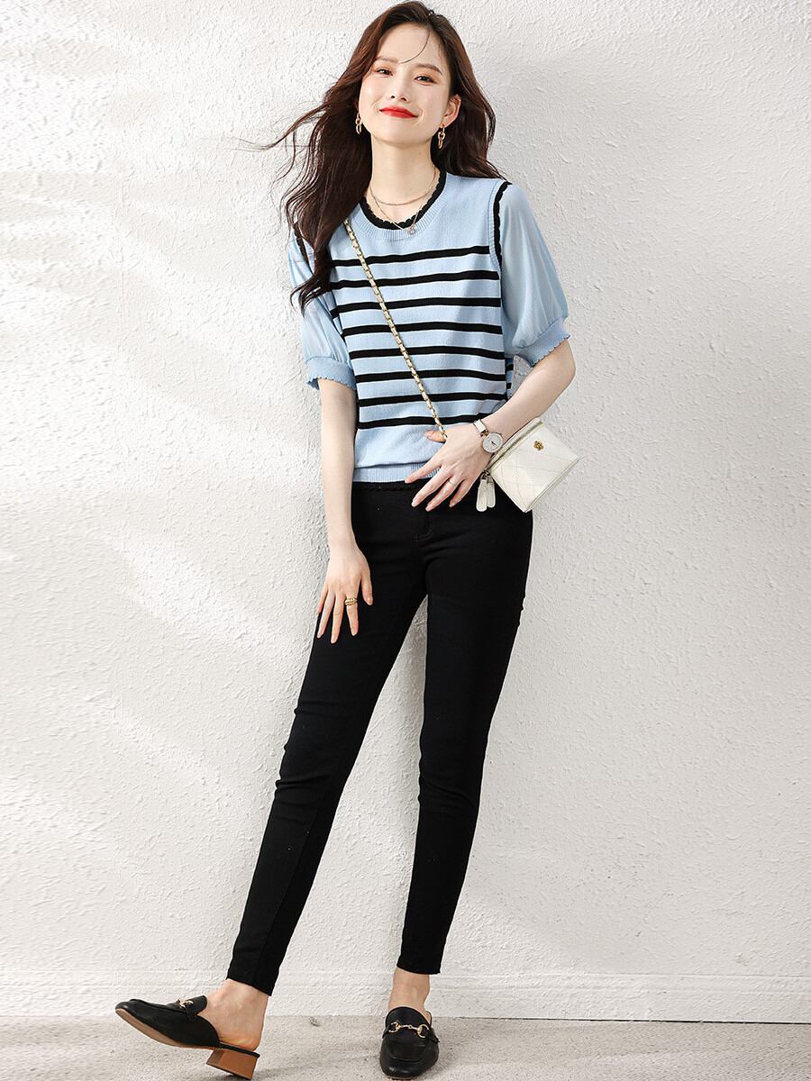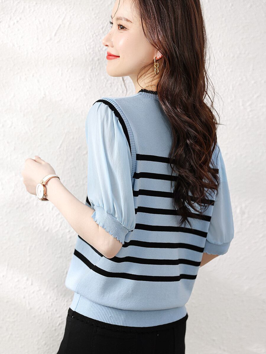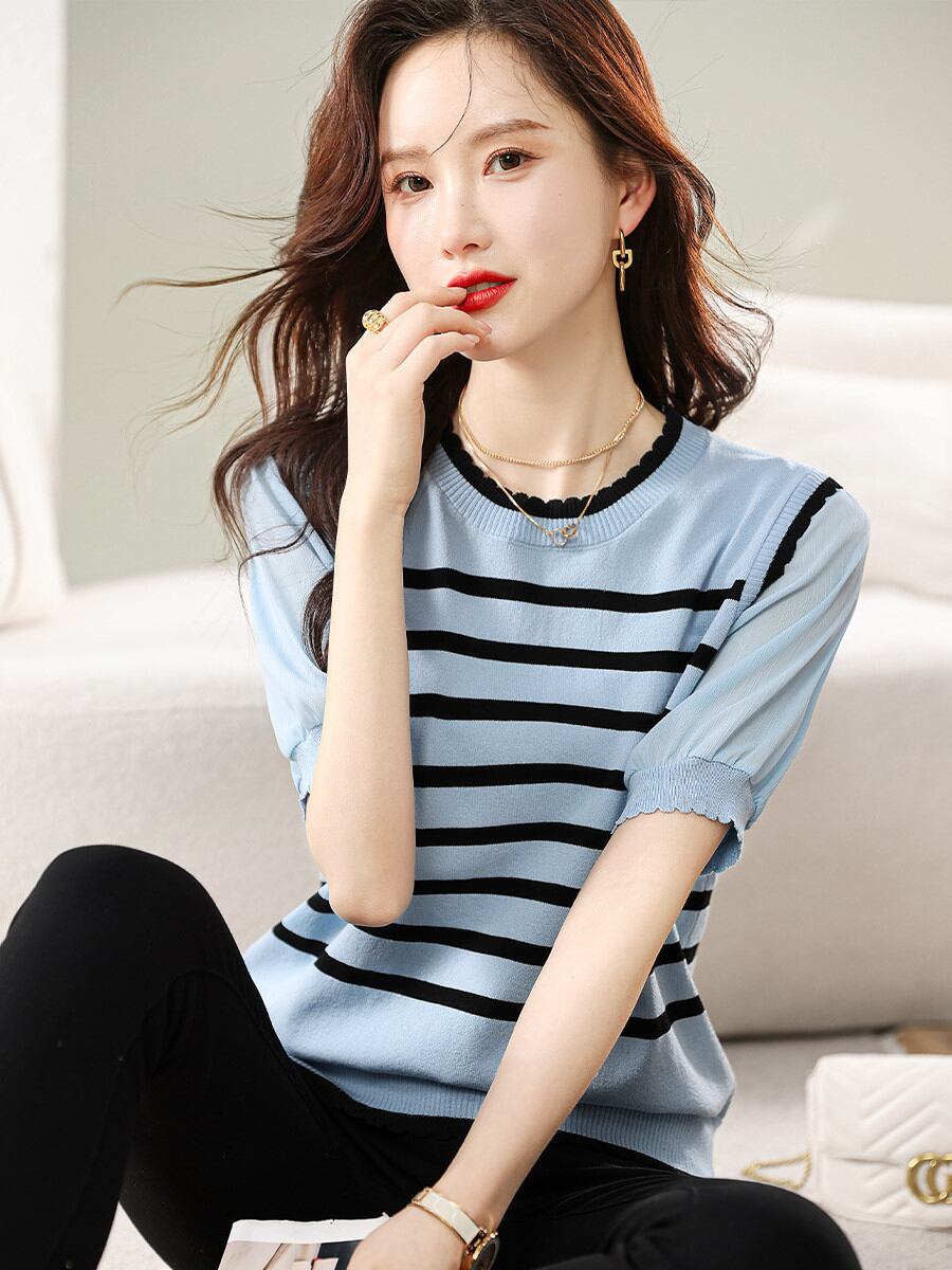 初回送料無料 ストライプ半袖Tシャツ パッチワーク レーディスファション商品 人気ブラウス