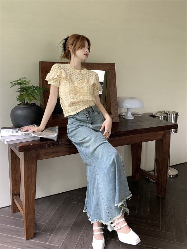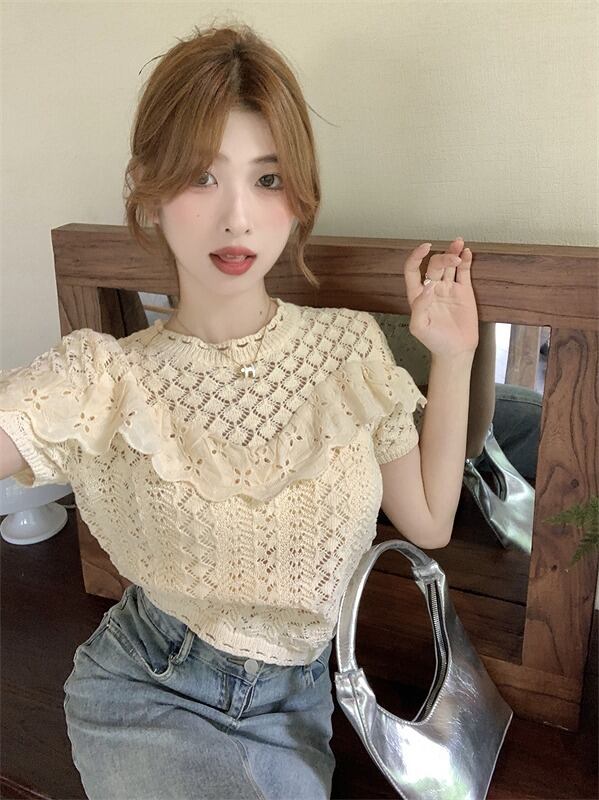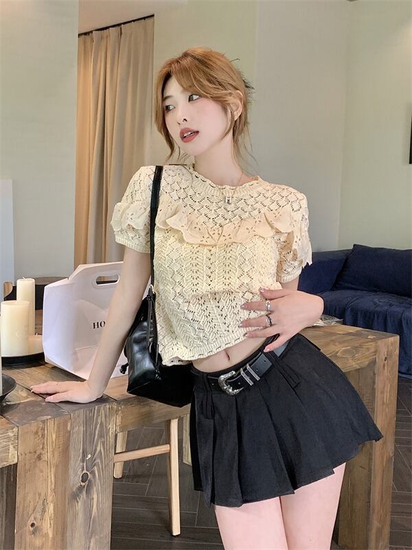 半袖Tシャツ 透け編み フリル スリム 着痩せ カットソー sweet系