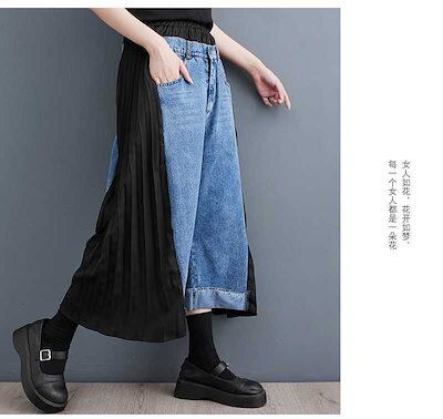 「ファットガール」 秋 九分丈 デニムパンツ ドッキング レトロ プリーツ ワイドパンツ ハイウエスト スラックス レディース ロングパンツ メガ割
