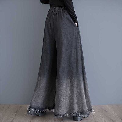 「ファットガール」 2024秋新品 デニム ワイドパンツ 大きいサイズ 体型カバー レディース フレア ゴム グラデーション ジーンズ ロングパンツ メガ割